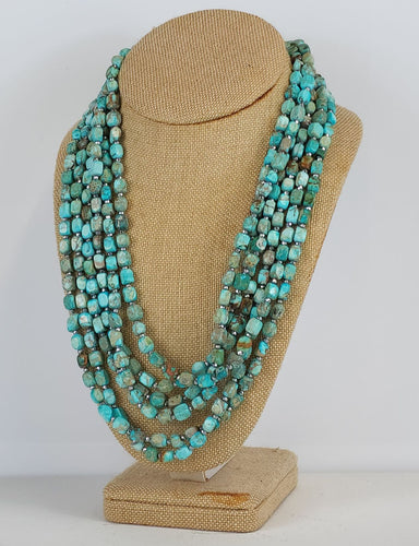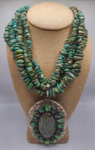 Five Strand Green Turquoise Gemstones With Variscite Cabochon Gemstone Accents - Statement Necklace With Large Sterling Silver Pendant