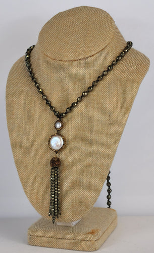 Pyrite Necklace With Fresh Water Coin Pearl and Chocolate Crystal Tassels